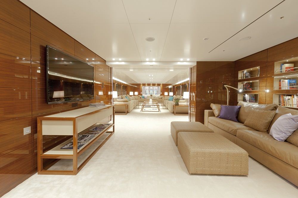 The 252 foot yacht is designed to accommodate up to 22 guests and a crew of 16. Taking advantage of her sleek styling, many of the spaces were designed with outdoor living in mind. Expansive outdoor deck areas are plentiful, creating an environment designed for comfort while relaxing and playing at sea. An amazing sun deck features large sun pads and a fully equipped bar with Bimini shades that can be opened to cover the entire area. And an adjoining open cabana area can be enclosed with removable glass walls and used as a dining area surrounded with glass on three sides, providing unsurpassed views. Below the sun deck is a fully equipped beach deck at water level. The main deck features an unusual outdoor cinema, a nightclub quality outdoor sound system and a day spa with a separate massage room. The multi-purpose aft outdoor area flanks a glass walled Jacuzzi that accommodates eight comfortably, and don’t forget onboard service is there to your glass filled. And for guests who get bored, a touch and go heliport is unobtrusively positioned on the bow, while a variety of tenders and jet skis are available for playing in the water. The extraordinary amount of outside living area is a huge departure from the norm for a yacht this size.